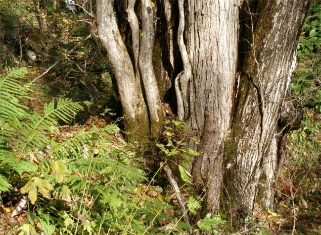 ![]() 上流に向かってトラバースしていくと大きなカツラの木があった |
