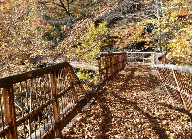 橋の真ん中辺りから滝が見えてくる。記憶の中の滝より大きなものだった。 滝の全景を見ようとしたが、滝は橋の裏の方まで延びていて滝壷までは(あるとしたらだが)見えなかった。 |