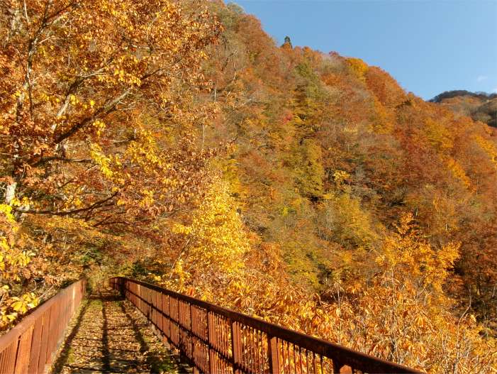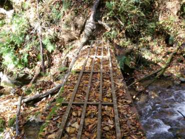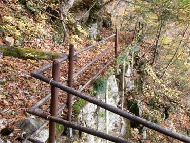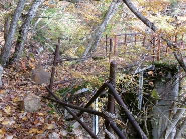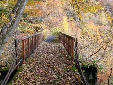 一度通っているとはいえ、トンネルを抜けてほっとする。熊にも蛇にもコウモリにも遭遇しなくてよかった。 だが、橋の上で猪に遭遇したらどうしよう? はじき飛ばされて橋から落ちたら即死だ。 |