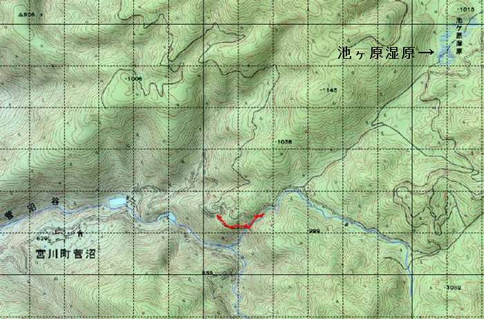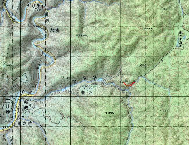 記憶にあるのは宮川沿いの菅沼にあったということだけ。池ヶ原湿原の帰りに見つけたはずだ。 地図を見ると、林道から川に向かって延びている道がある。川で行き止まりになっていて滝のマークがある。ニコイ大滝に間違いない。近くに鍾乳洞もあるはずだ。 熊は怖いがこんなショボイところに友人は誘えない。単独で出かけることにした。 |