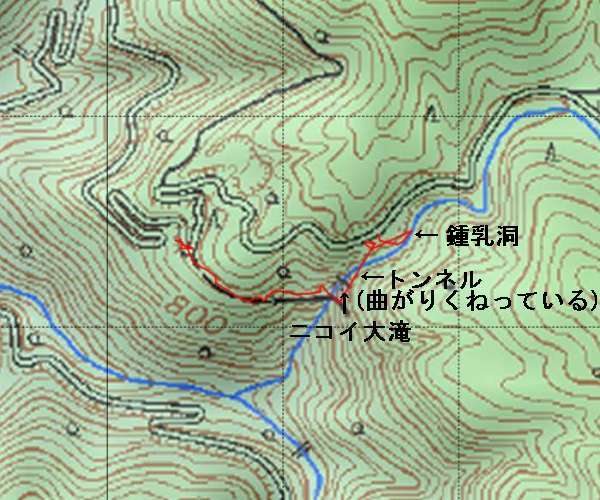 駐車場所【13:20】(7分)ニコイ大滝<見学7分>トンネル入口(11分)トンネル出口(10分)菅沼のカツラ<探索5分>(8分)トンネル出口(4分)トンネル入口<見学8分>(10分)駐車場所【14:50】 行き28分+帰り22分=歩行50分 歩行50分+探索他20分=合計1時間10分 | |