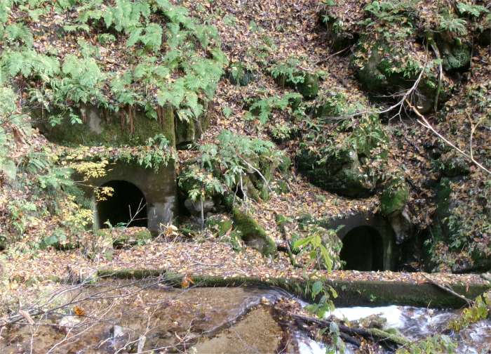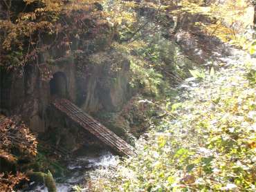対岸(左岸)にトンネルを二つ発見する。一瞬、鍾乳洞かと思ったが場所が変だ。川底より低いところにある。 何かの水路の入口だと思った。徒渉して靴を濡らすのも嫌だったので行くのをやめた。これが失敗だった。 帰ってから調べたら、これが鍾乳洞だった。何故、二つあるのだろう? 入口と出口か? |