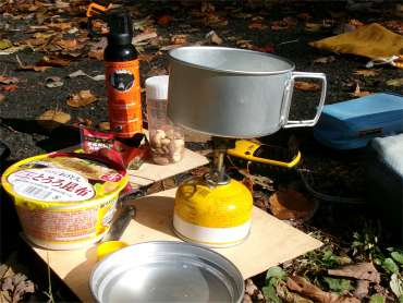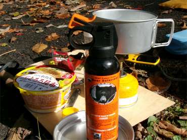 山の中で料理をしたら匂いで熊を刺激してしまう。(どこでやっても同じかもしれない) お昼を過ぎていておなかも空いていたのでランチを取ってから出かけることにした。 熊スプレーを手元に置き、ヘルメットも被って、立ったままランチをとった。 |