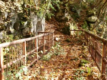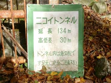 橋は最後に右に折れていて、その終点に鍾乳洞の入口らしきものがあった。記憶では鍾乳洞は滝とは離れた場所にあったはず。 入口に看板があった。「延長134m 高低差30m トンネル内は急勾配です 足下に充分ご注意ください」と書いてある。ただのトンネルだった。 不思議なのは看板もトンネルの入口も、どう見ても50年前のものとは思えない。謎が広がる。 |