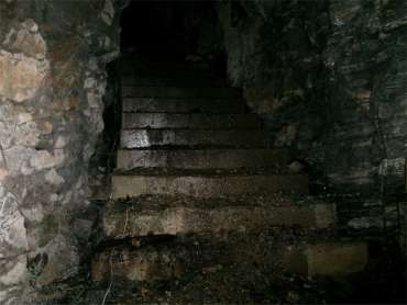 よく見ると床は所々に落ちた石が転がっている程度で、きれいだ。岩盤が固いのだろう。頭に石が落ちてくる心配もなさそうだ。先に進むことにする。 30m〜40mほど進んだところで左に曲がっていた。曲がっているトンネルは珍しい。 曲がったところからコンクリートの階段が続いていた。階段があるトンネルも珍しい。 |