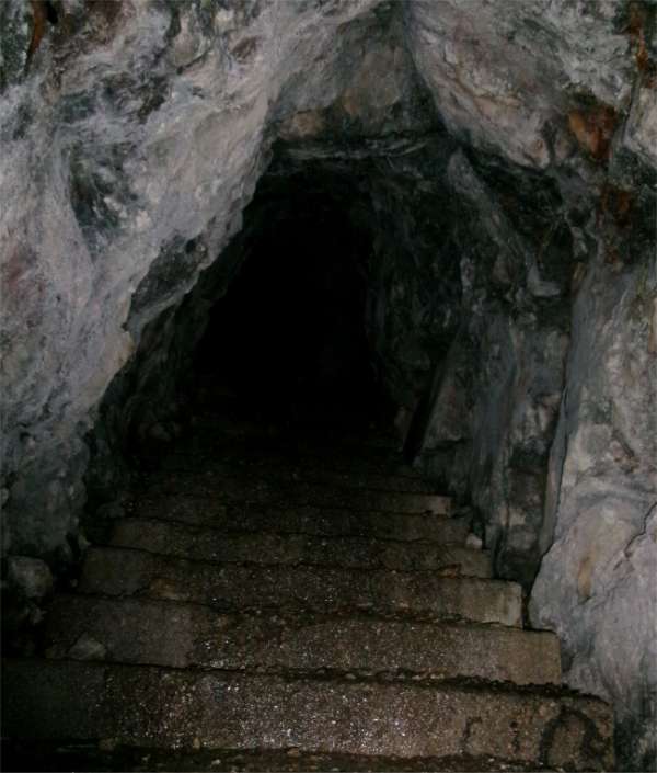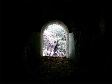 階段が終わったところから右に緩やかに曲がっていく坂道になった。さらに左に少し曲がるとふたたび階段が現れた。 その短い階段を登り切ると、トンネルは左に直角に曲がっている。左に曲がってみると正面に明かりが見えた。ほっとした。本当にほっとした。 何故、こんな屈曲したトンネルを作ったのか不明だ。設計をした人が、まだ生きていたら、聞いてみたい。 |