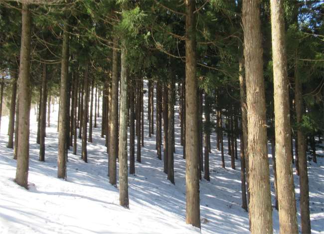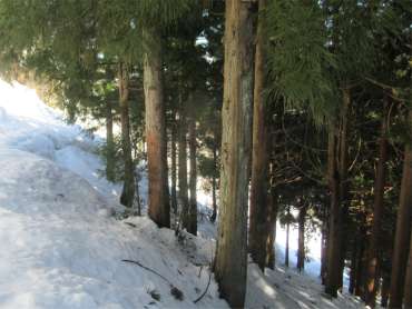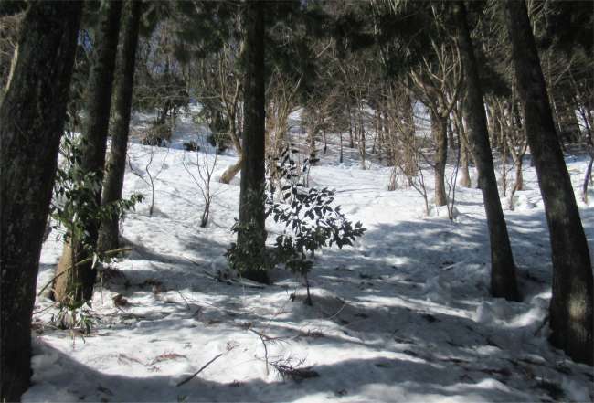 以前(2021年2月20日)東尾根の稜線を直登したことがあった。灌木が多かった。大きくはないが礫岩が行く手をさえぎり、細い稜線を巻くのに苦労した。 今回はその轍を踏まないようにコースを右に少しずらした。 |