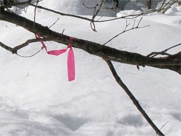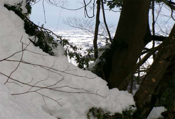 今日の山行は急斜面が想定されたのでスノー・シューズとカンジキの両方を持ち込んだ。登りにスノー・シューズを使い、降りはカンジキを使った。 スノー・シューズは急な降りに弱いからだ。 |