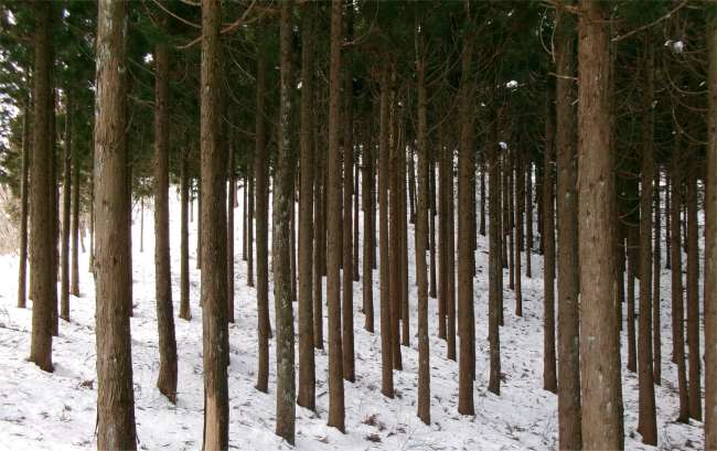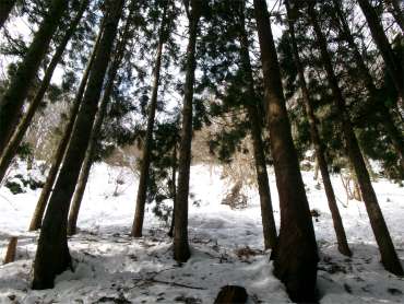 ![]() 林道を外れて杉林に入る |