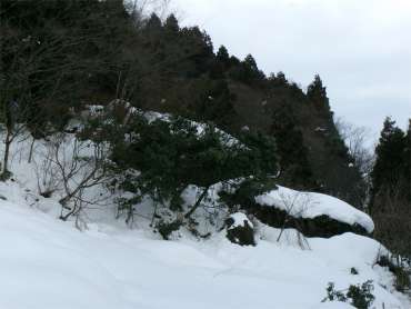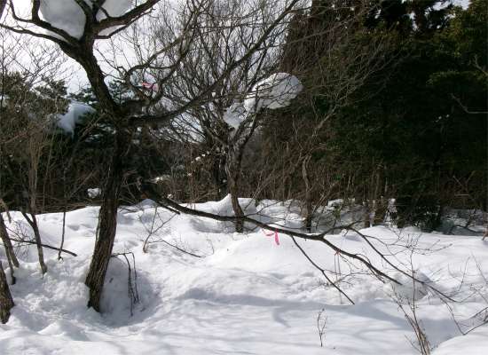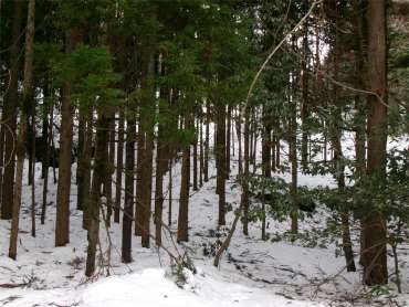 ![]() 東尾根の南斜面を降り杉林に入り割山の集落跡に出る |