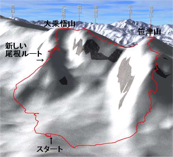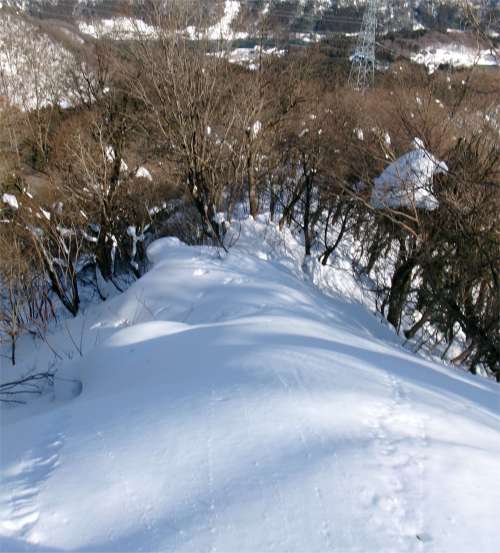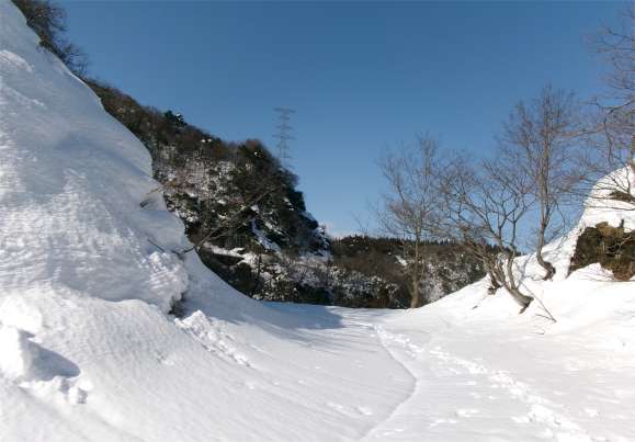 いったん笹津山から楡原に抜ける林道を横断する。(これがなければ完璧なのに) 先端まで行くと急なので途中で右か左に逃げなければいけない。右は少し急で雪が切れるかもしれない。左はなだらかなのでこちらを選んだ方がいい。 今回は偵察のため、あっちこっちと歩いてしまったのでカシミールのトレースが乱れてしまった。 |