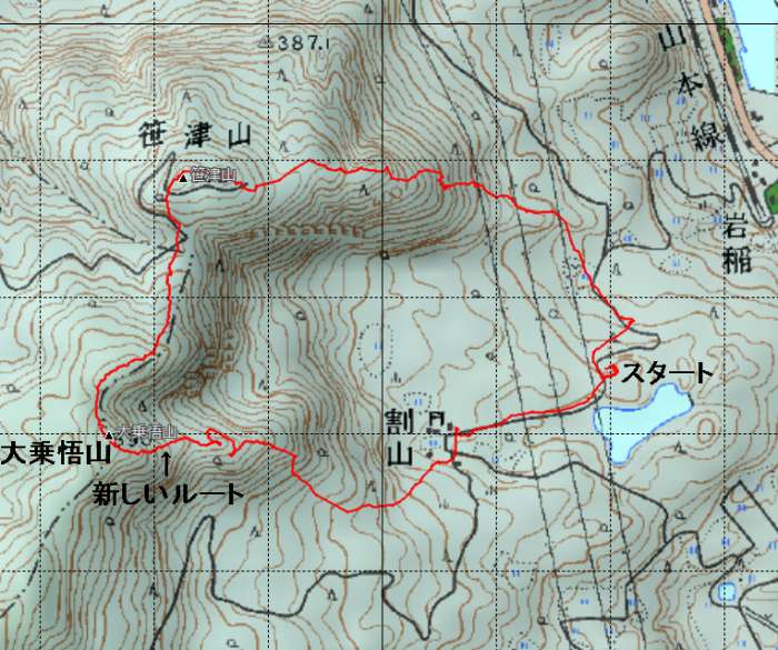 天湖森駐車場【9:15】(2時間5分)笹津山頂上【11:20】<休憩10分>(55分)大乗悟山【12:25】<休憩55分> 大乗悟山【13:20】(1時間10分)天湖森駐車場【14:30】 登り3時間+降り1時間10=歩行4時間10分 歩行4時間10分+休憩1時間5分=合計5時間15分 | |