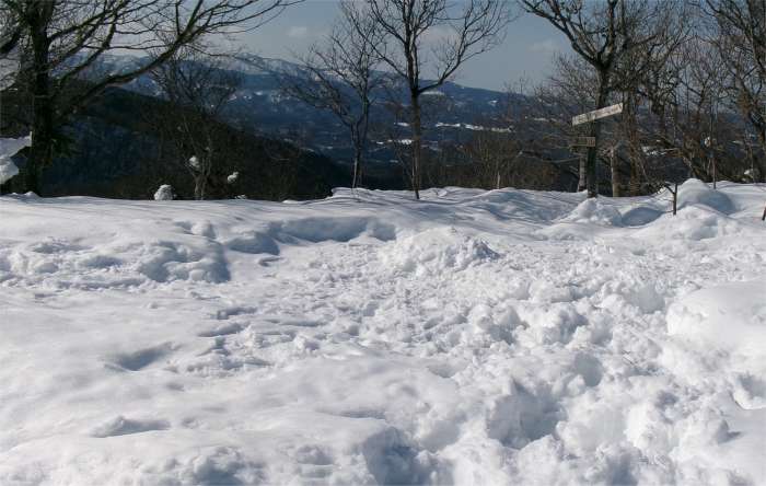 | 12時25分、大乗悟山の頂上に出る。広くて真っ平らだ。100人ぐらいいても大丈夫そうだ。北アルプスの展望もいい。宴会跡も沢山あった。 |