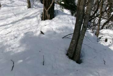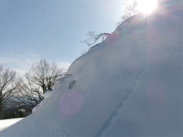 鉄塔を目指すのが分かりやすいだろう。鉄塔から先は灌木と大きな岩を避けながら上へと方向をかえる。ルーファイはそんなに難しくない。 だが、灌木のない広いところは雪崩がひんぱんに、おきている可能性が高いので注意が必要だ。 |