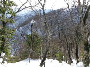 大乗悟山への稜線から降りで使う予定の東尾根が見えた。斜度は30度まではないようだ。(三角定規を頭に思い浮かべて判断) 思っていたより急な感じがする。現場に行ってみないと分からないが、ダメなら登り返せばいい。 |