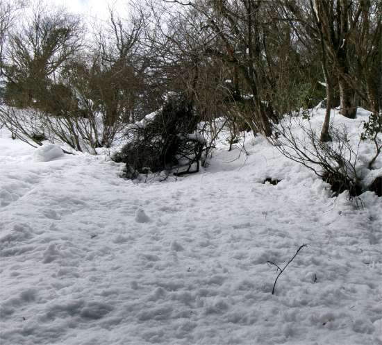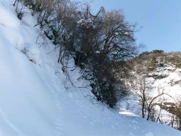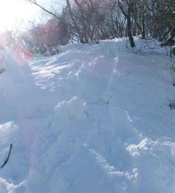![]() 車道の途中から除雪されていない林道に入る |