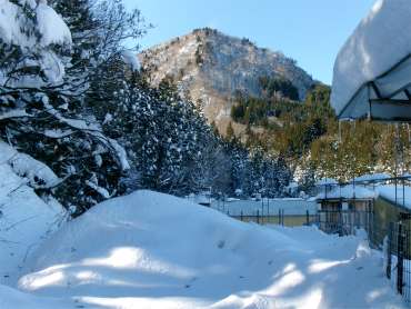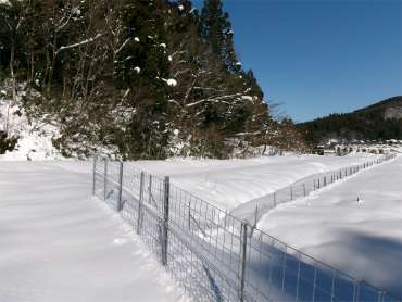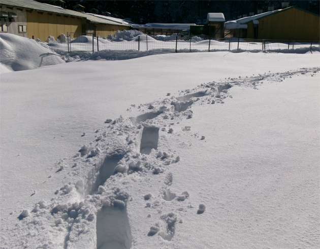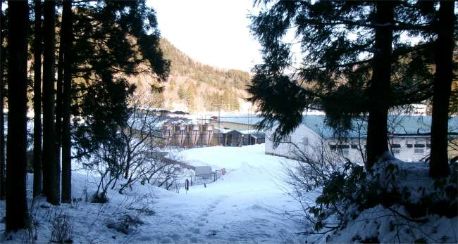 ![]() 豚舎横からスノーシューズを履く |