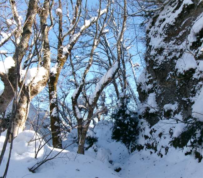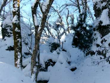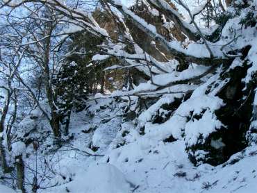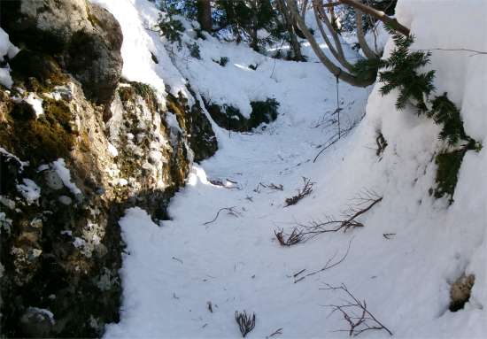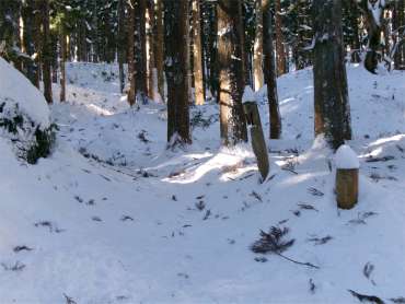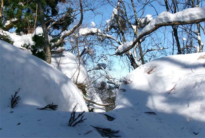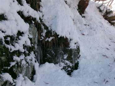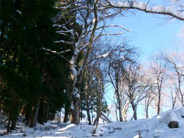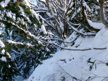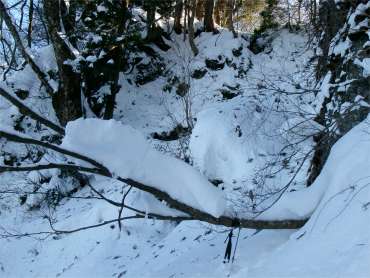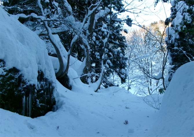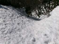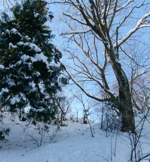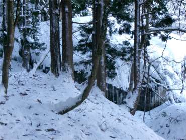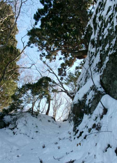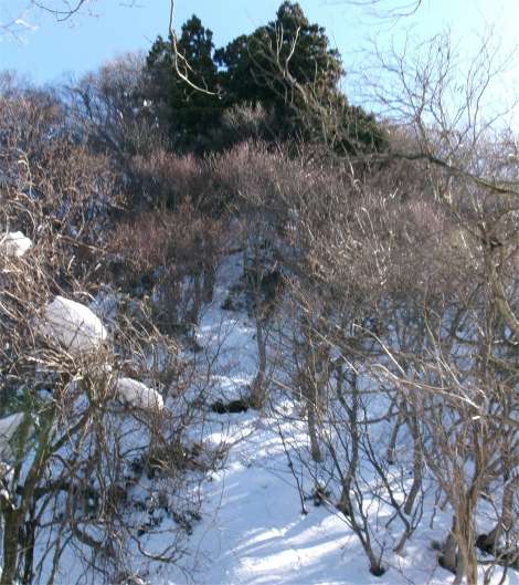 かけだしの頃、登山道を知らずに登った。雪が深く、ここで敗退した。登山道だとは思えなかったし、その辺りの何か出てきそうな雰囲気も怖かった。未熟だったな〜と思う。 (今見ても、登山道には見えないし、陰湿だが) |
