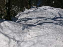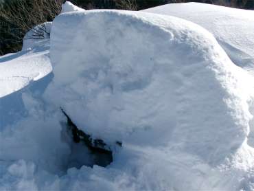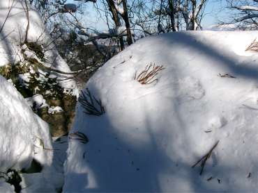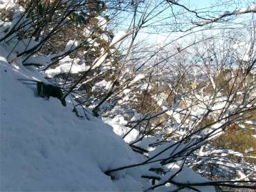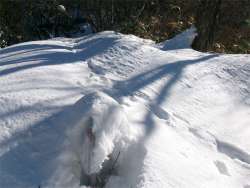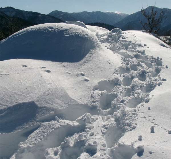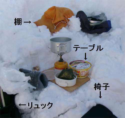 13時55分、松瀬峠のすぐ下で昼食をとった。峠から3mほど降っただけで風がない。体には少し日も当たって暖かい。 階段状に椅子とテーブルを作った。初めての経験だったが、これはこれで快適だった。 |