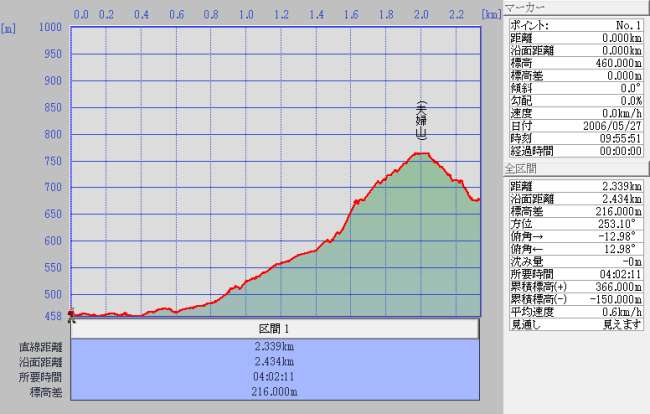 | 沿面距離 | 登り1.8Km(道迷い含む) 降り1.5Km | |