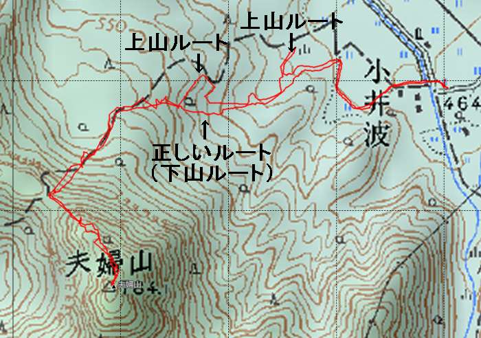 小井波【9:55】(2時間10分)松瀬峠(1時間25分)夫婦山頂上【13:30】<休憩5分> 夫婦山頂上【13:35】(20分)松瀬峠<休憩40分>(30分)小井波登山口【15:05】 登り3時間35分+降り50分=歩行4時間25分 歩行4時間25分+休憩45分=合計5時間10分 | |