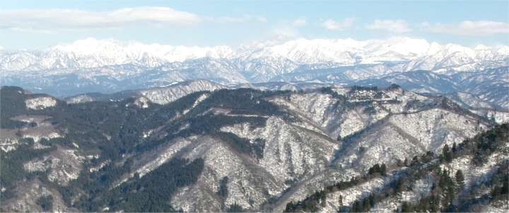 ![]() 東側には北アルプスの山並みが連なる(僧ケ岳から黒部五郎岳まで) |