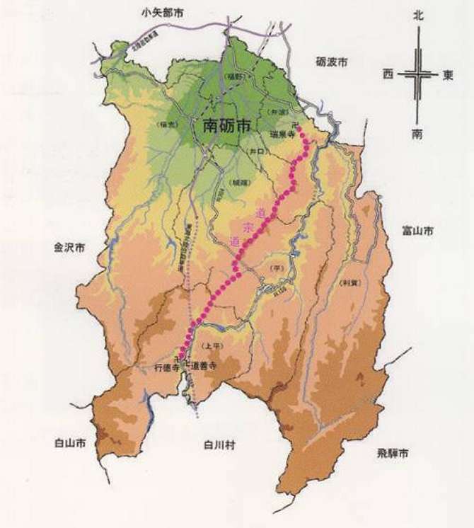 道宗道とは約500年前、赤尾の道宗(僧侶)が月に一度、西赤尾の行徳寺から井波の瑞泉寺に詣でるために歩いたとされる尾根筋の山道である。 西赤尾町から井波町まで距離56Km、累積標高差3600mを道宗は1日で歩いた。 途中、高落場山、高清水山、赤祖父山などを縦走し、最後に通過する山が早乙女山である。 道宗は信仰心が厚かったのではなく、単に山歩きが好きだっただけではないのかと思う。のですが? |