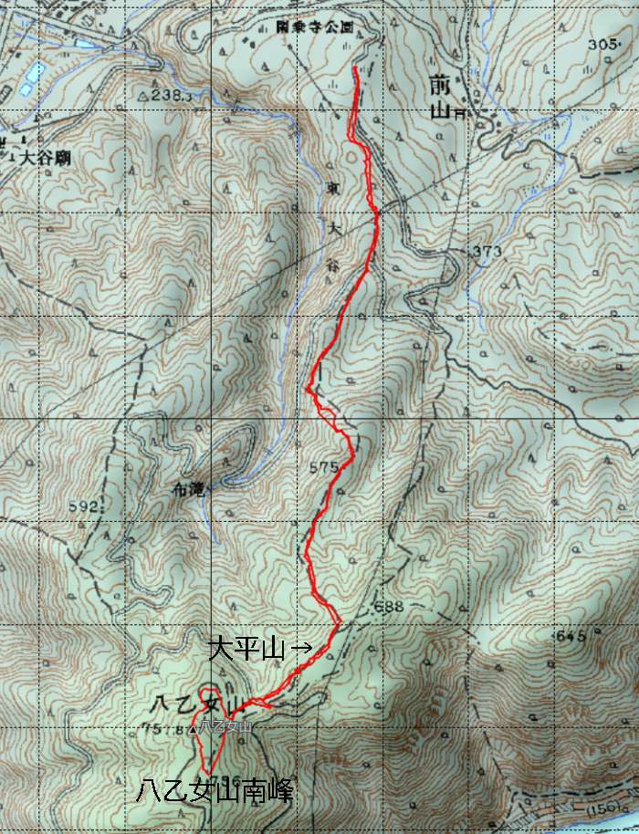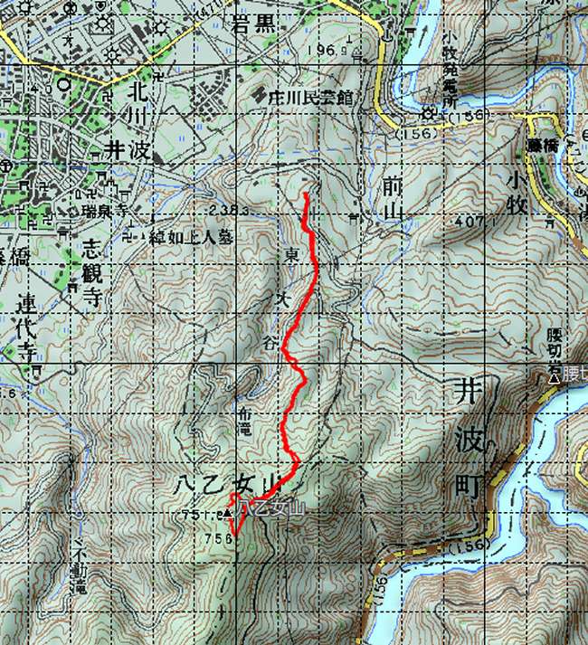 八乙女山は道宗道をたどって井波の瑞泉寺から古道をたどったことがあった。ひどい藪漕ぎだった。 2回目は西赤尾の行徳寺から2日かけて歩いたときに最後に通過した山でもあった。 だからか、八乙女山は「道宗道が通る信仰の山」というイメージが強い。 |
